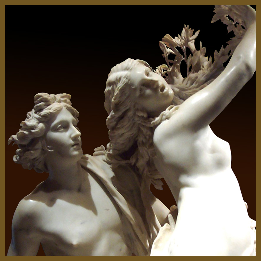 En la persecución, la ninfa huía en busca de su padre el río Peneo, al que exhortó de la siguiente manera: “¡Padre mío! Si es verdad que tus aguas tienen el privilegio de la divinidad, ven en mi auxilio…, o tú, tierra, ¡trágame!…porque ya veo cuán funesta es mi hermosura…Apenas terminó su ruego, fue acometida por un espasmo. Su cuerpo se cubre de corteza. Sus pies, hechos raíces, se ahondan en el suelo. Sus brazos y sus cabellos son ramas cubiertas de hojarasca. Y, sin embargo, ¡que bello aquel árbol! A él se abraza Apolo y casi lo siente palpitar. Las movidas ramas, rozándole, pueden ser caricias”.