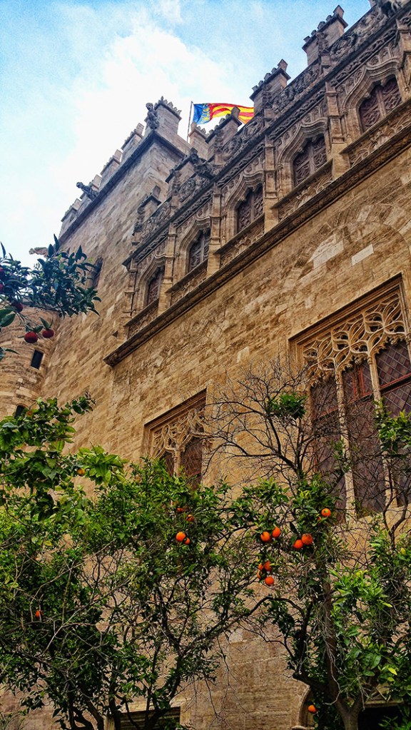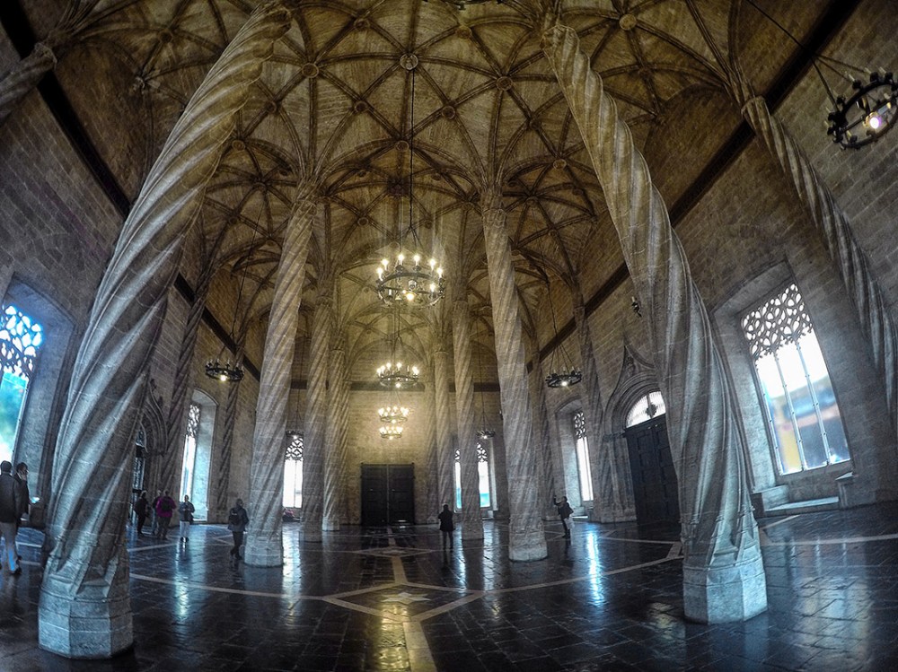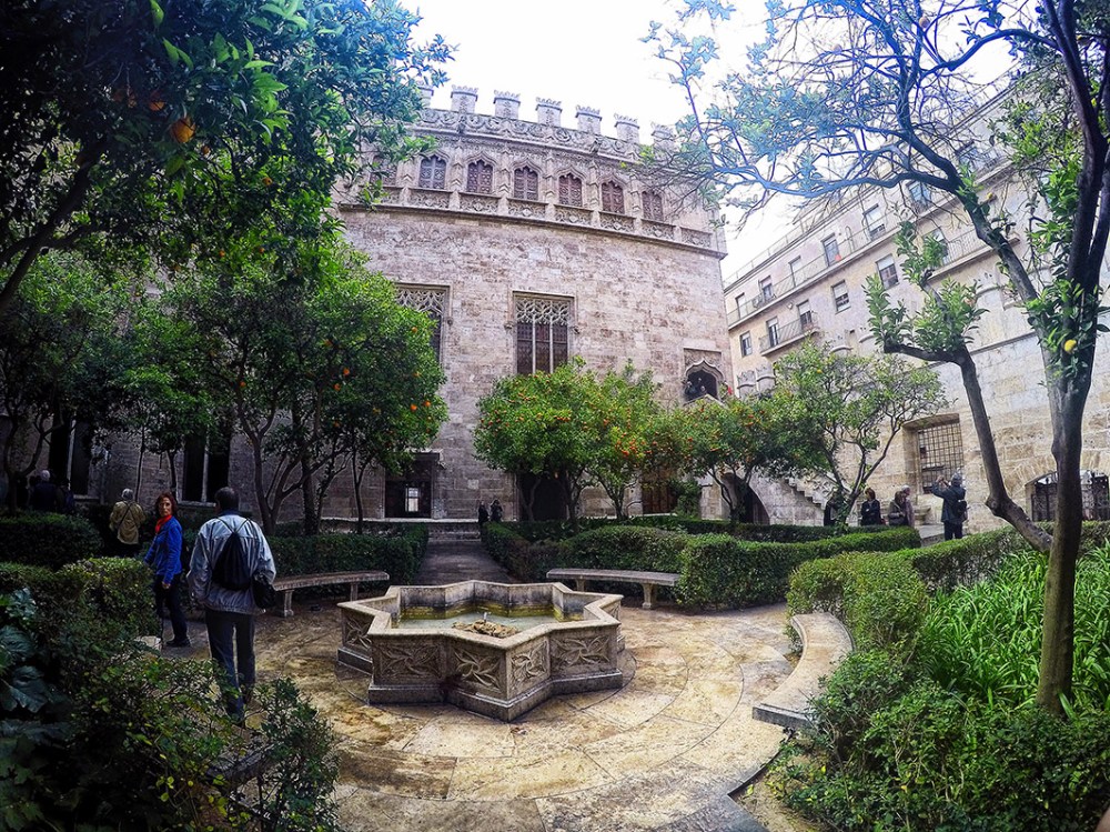 La Lonja de la Seda o de los Mercaderes está considerada como un magnífico ejemplo de la arquitectura gótica civil, no solo española sino europea. Dado el incremento del desarrollo de la actividad comercial con la consiguiente prosperidad generada a lo largo del siglo XV, se evidenció la necesidad de crear una nueva sede para la lonja y en 1469 se decidió su construcción. Las obras se prolongaron desde 1482 a 1498 siendo Pere Compte su principal artífice. El edificio presenta importantes fachadas rectangulares rematadas por coronas reales y originales pináculos y gárgolas. El interior nos sorprende por su espectacular salón columnario denominado Sala de Contratación en el que destacan ocho columnas y dieciséis pilastras helicoidales. La lonja cuenta además con un patio interior con naranjos y con el Consulado del Mar, que conserva un hermoso artesonado de madera. Éste último fue construido en el año 1498 bajo la dirección de Pere Compte quien falleció sin verlo finalizado. Varios maestros continuaron las obras después de su muerte, que fueron concluidas en 1548.