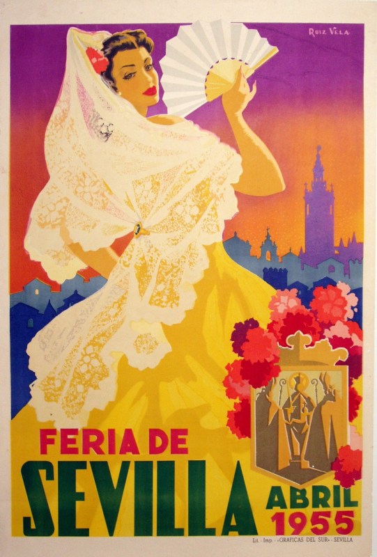 El origen del traje de flamenca actual es una derivación de los vestidos que usaban las mujeres de los tratantes de ganado, muchas de ellas gitanas o campesinas, que acompañaban a sus maridos a las ferias. Era muy sencillo y consistía en una simple bata con volantes en la falda y un delantal para las faenas, por este motivo también se le llama “traje de gitana”. Paulatinamente, este modelo evolucionó hacia lo que conocemos como “cuerpo de guitarra”, convirtiéndose en el atuendo por excelencia para acudir al Real. Hacia 1929 y coincidiendo con la Exposición Iberoamericana, el traje de flamenca fue adoptado por las señoras de clase alta.