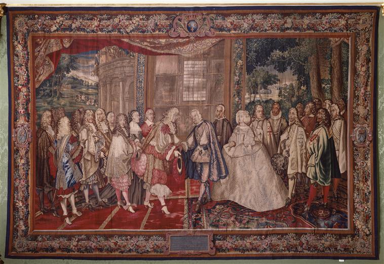 El encuentro del séquito francés y español, con motivo de la entrega de la infanta y de la firma de la Paz de los Pirineos, tuvo lugar en la isla de los Faisanes en el río Bidasoa. El episodio se puede contemplar en un tapiz realizado en la fábrica de los Gobelinos entre 1665 y 1668. La escena que representa es el fiel reflejo de lo dispar de los gustos francés y español. Felipe IV aparece sobriamente ataviado de negro con calzas, jubón y golilla, ofreciendo a su hija. La infanta luce un aparatoso guardainfante de satín blanco bordado y adornado de pequeños lazos de plata, junto al peinado característico de este indumento. Detrás vemos la comitiva en la que figuraba el pintor Diego Velázquez, que acudió en calidad de aposentador de palacio, y que fallecería poco después. En frente, la comitiva francesa con el joven Luis XIV seguido de su hermano Felipe de Orleans. Todos portan grandes pelucas y complicados trajes repletos de encajes, cintas y adornos.