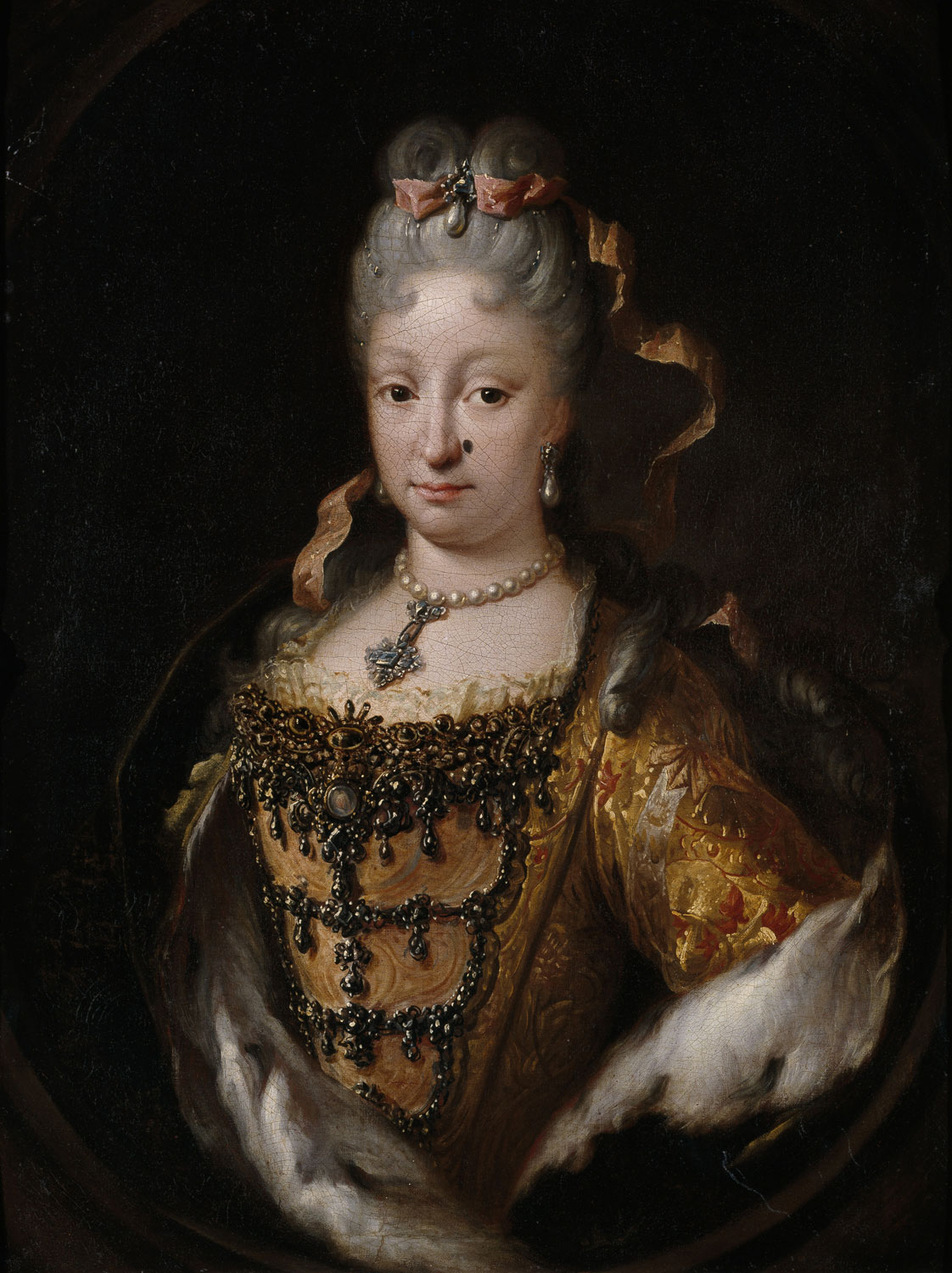 Los pendientes se denominaban de varias maneras tales como zarcillos, aretes, perendengues o arracadas. La marquesa solo contaba con dos pares, unos aretes de perlas y unos zarcillos de brillantes. En cambio, tenía un collar de perlas de tres vueltas con 141 cuentas. La perla era la gema más costosa debido a lo complicado de su extracción: los collares se ensartaban con cuerdas de vihuela. Las reinas María Luisa de Saboya e Isabel de Farnesio lucen gargantillas de perlas en diversos retratos.