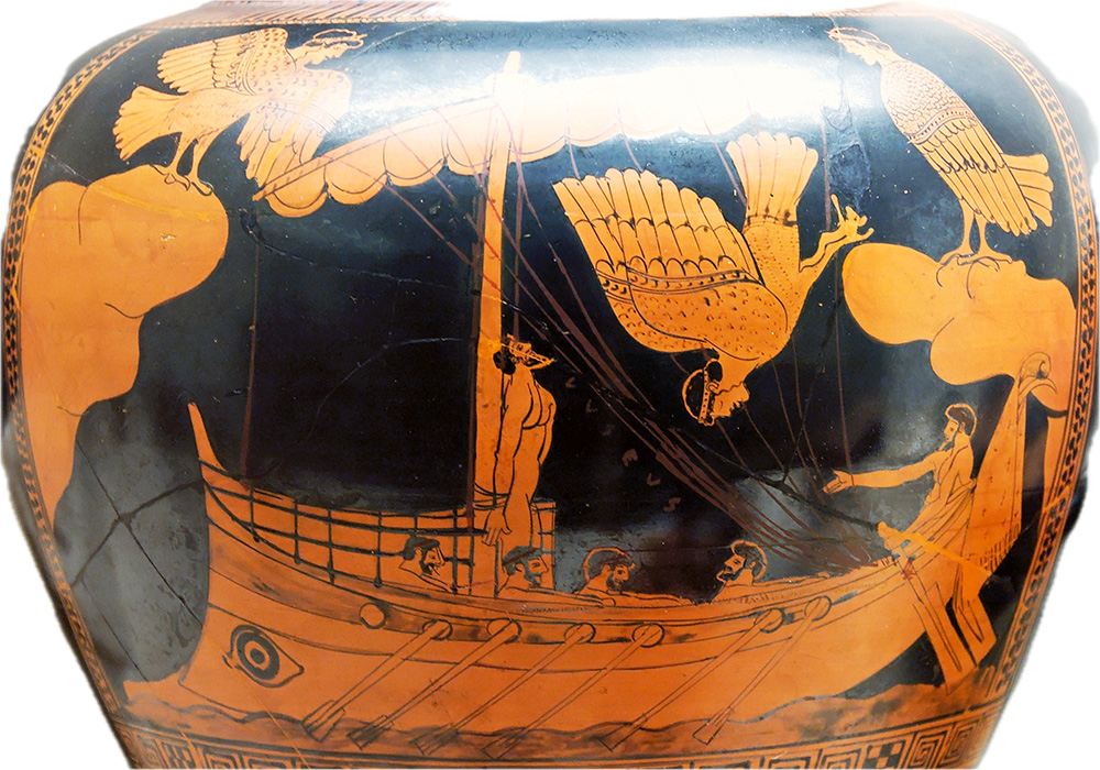 Entretanto la bien fabricada nave llegó velozmente a la isla de las dos Sirenas pues la impulsaba próspero viento. Pero enseguida cesó éste y se hizo una bonanza apacible, pues un dios había calmado el oleaje.