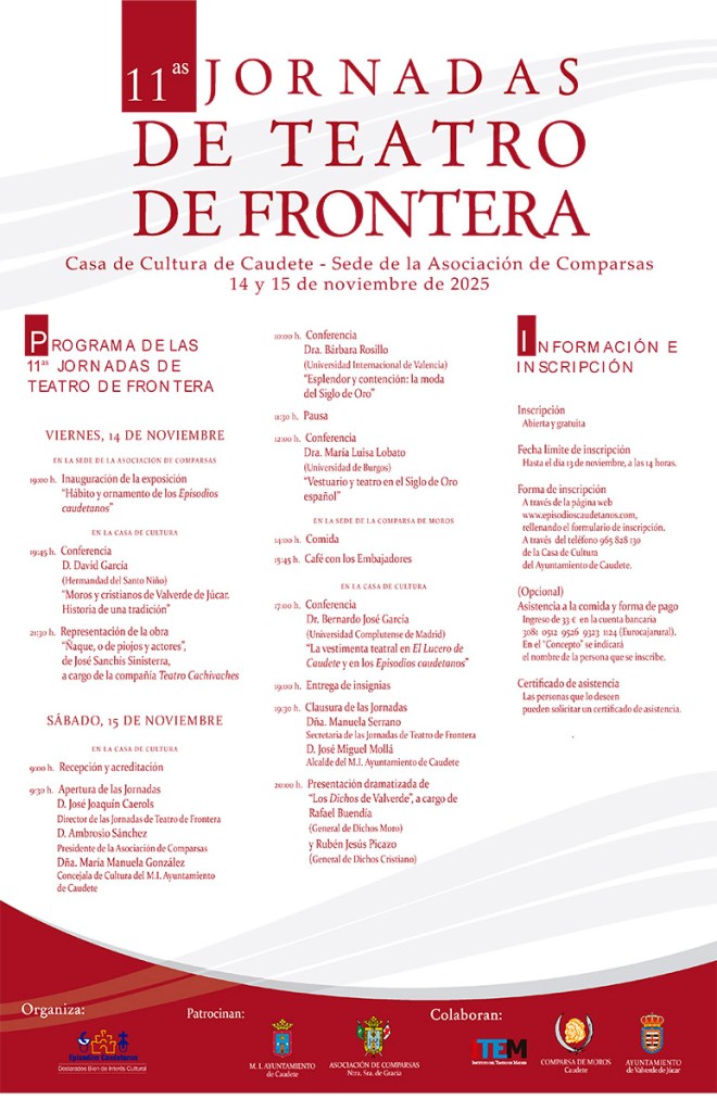 Los días 14 y 15 de noviembre de 2025 se celebrarán las 11 Jornadas de Teatro de la Frontera en Caudete. Este evento cultural reúne diversas actividades teatrales y académicas relacionadas especialmente con el teatro clásico y del Siglo de Oro. En las presentes Jornadas, he sido invitada a participar con la conferencia titulada «Esplendor y contención: la moda del Siglo de Oro» en la que trataré los puntos claves de la indumentaria y la moda, tanto masculina como femenina, de tiempos de Cervantes.