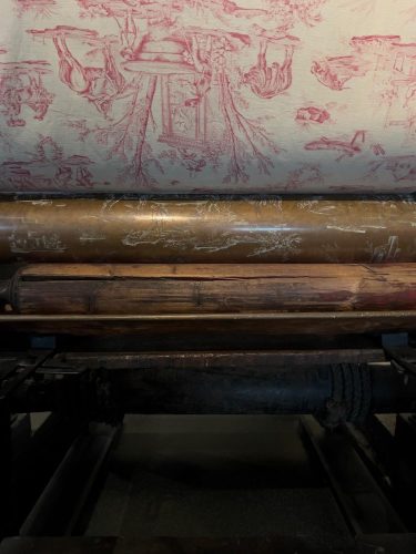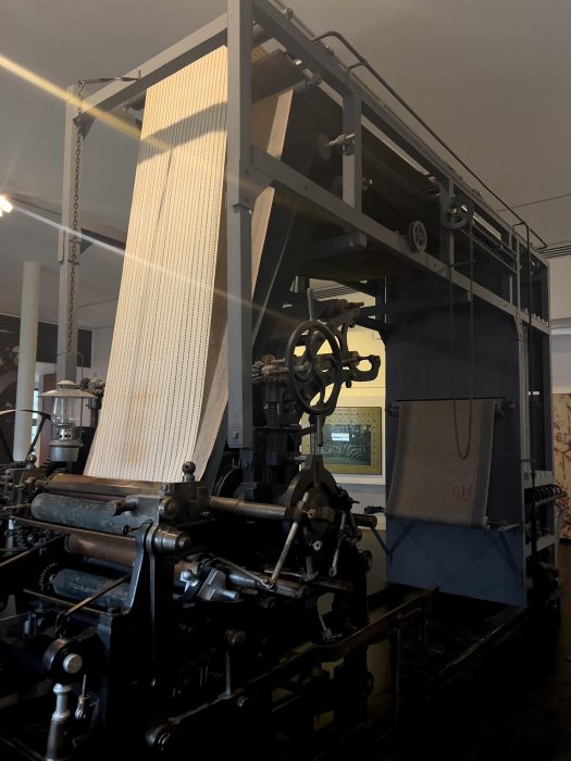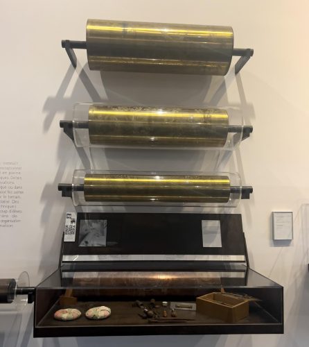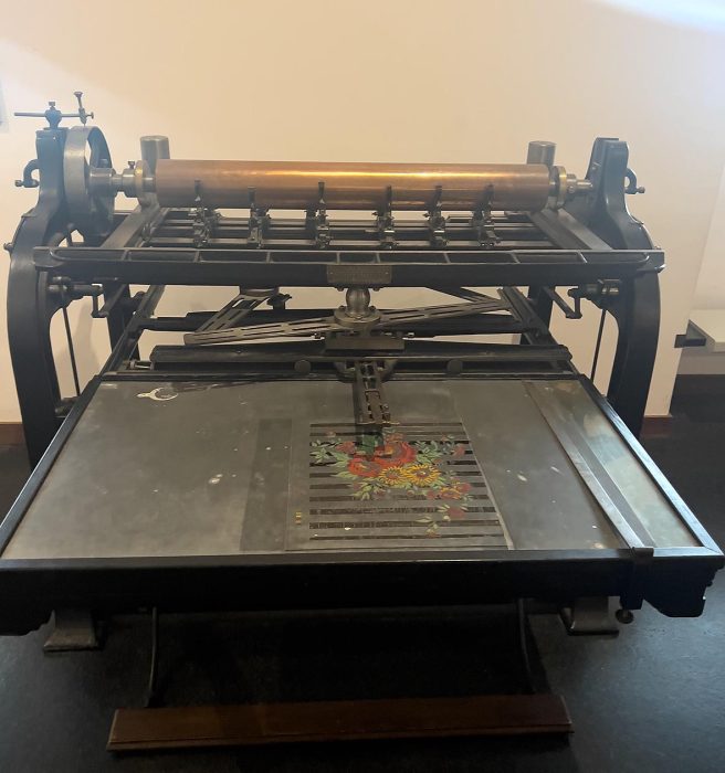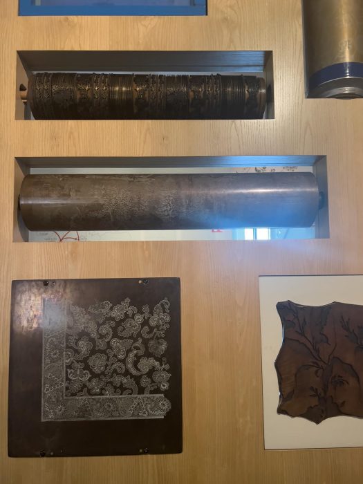 Junto a los tejidos, el museo conserva máquinas de imprimir, herramientas, pigmentos, cilindros grabados y documentación técnica, que convierten el MISE en un verdadero laboratorio para comprender cómo se traduce un dibujo sobre papel en un motivo repetido miles de veces sobre la tela.