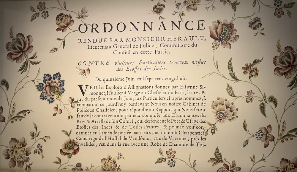 ORDENANZA dictada por el señor Hérault, teniente general de Policía, comisario del Consejo en esta parte. CONTRA varios particulares hallados vestidos con telas de las Indias. El quince de junio de mil setecientos veintiocho. Vistos los actos de citación entregados por Étienne Simonnet, alguacil con vara del Châtelet de París, los días 10 y 14 del presente mes de junio, a los particulares abajo nombrados, para comparecer hoy ante Nosotros en nuestro Gabinete de Policía del Châtelet, a fin de responder al informe que nos sería presentado sobre la infracción por ellos cometida de las Ordenanzas del Rey y de los Decretos de su Consejo, que prohíben el porte y uso de telas de las Indias y de telas pintadas, y para verse condenados a la multa establecida por las mismas; al nombrado Charpentier, conserje del Hôtel de Vendôme, calle de Varenne, cerca de los Inválidos, visto en la calle con una bata de casa de tela pintada (de indianas).